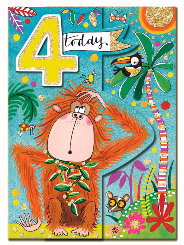 Utvikbart grattiskort till 4-åringen. Fira med orangutangen och hans vänner.