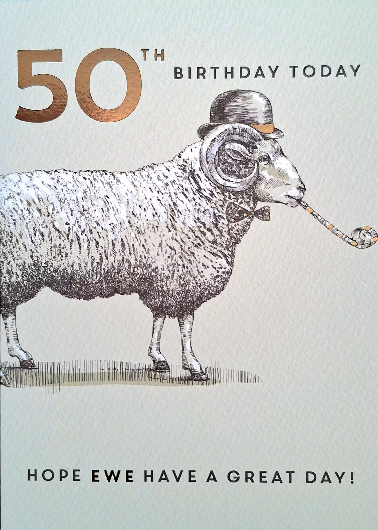 På kortet finns texten ”50th Birthday today. Hope ewe have a great day!”