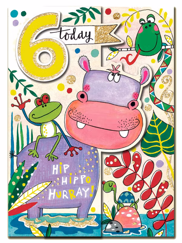 Utvikbart grattiskort till 6-åringen. Här vill flodhästen och hans vänner önska grattis till mottagaren.