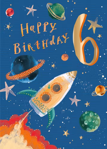 Härligt grattiskort med rymdtema, perfekt till den rymdälskande 6-åringen.