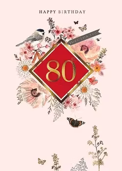Underbart grattiskort med året 80 i centrum och vackra blommor och fåglar runt omkring.
