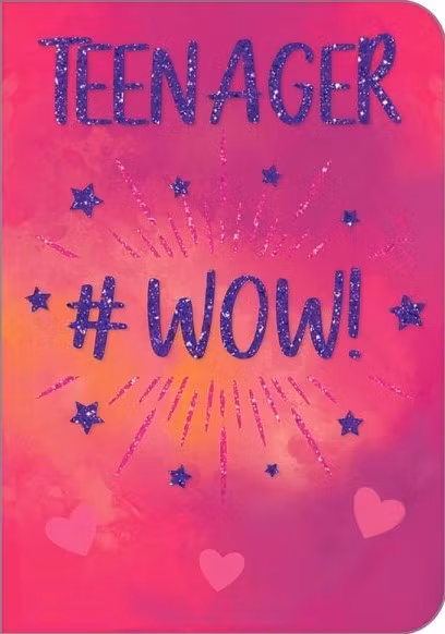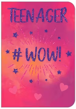 Färgstarkt kort fullt av stjärnor och hjärtan och texten ”Teenager #WOW!”.