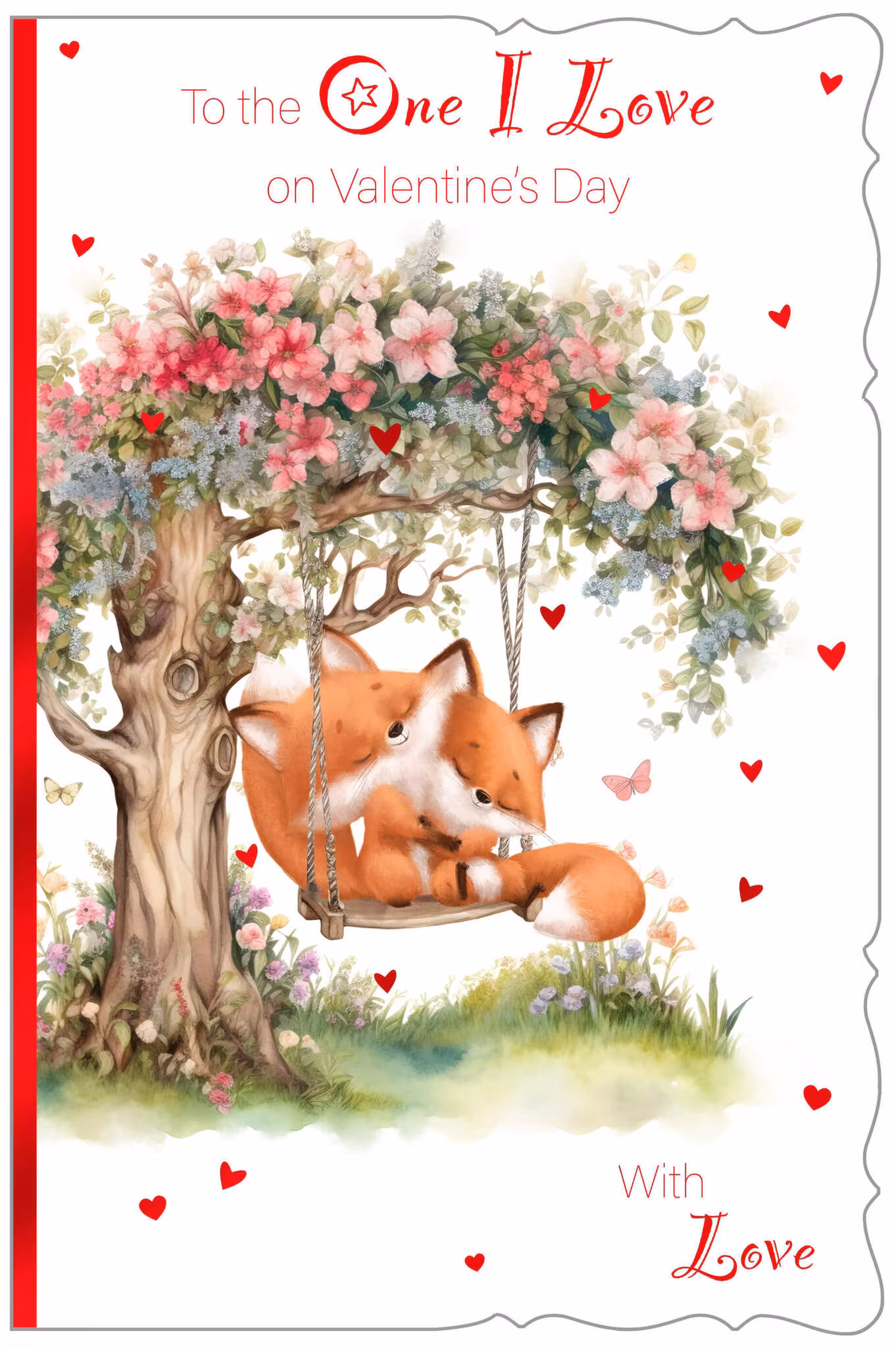 Gulligt Alla hjärtansdag-kort med de två rävarna som myser i gungan under det blomstrande trädet.