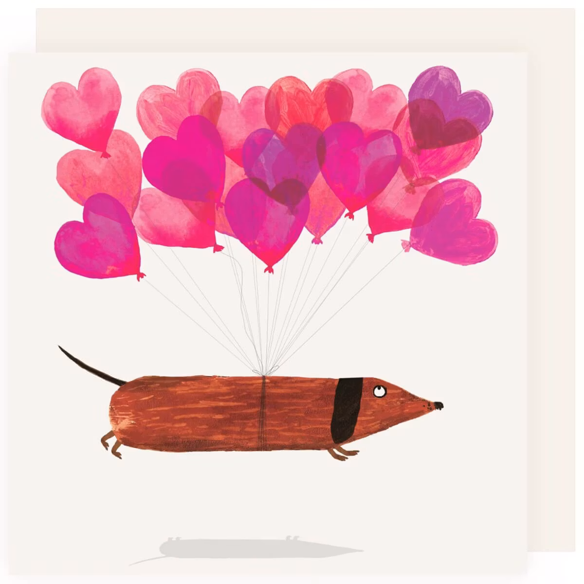 Härligt kort med taxen som svävar iväg med hjälp av kärleksfyllda ballonger.