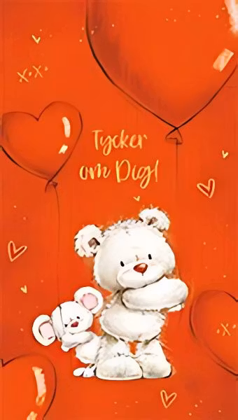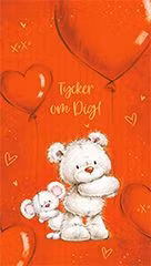 Gulligt kort med den söta nalleen och musen mot den röda bakgrunden.