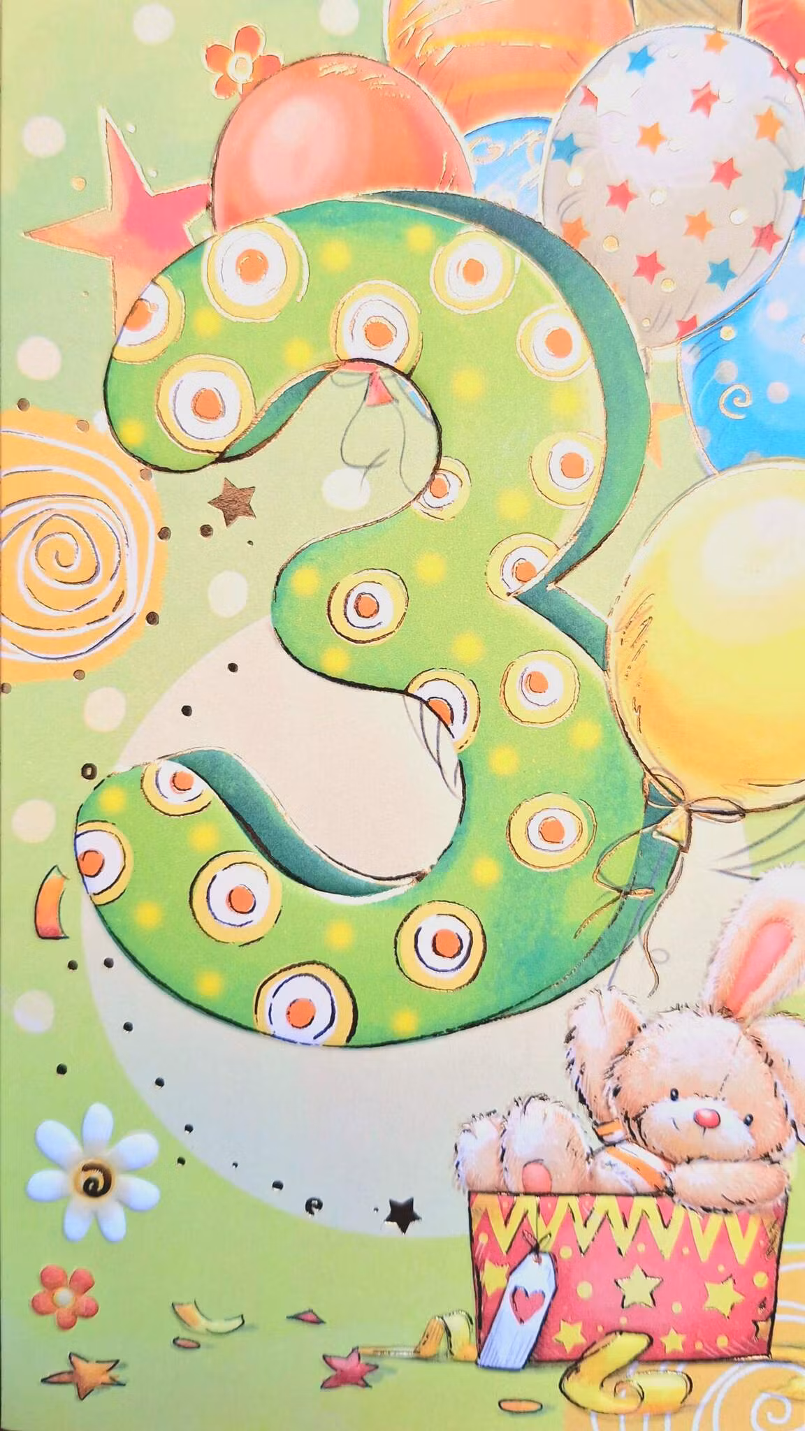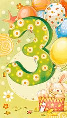 Härligt grattiskort med en härligt, färgglad trea och en söt liten kanin liggandes i ett paket.