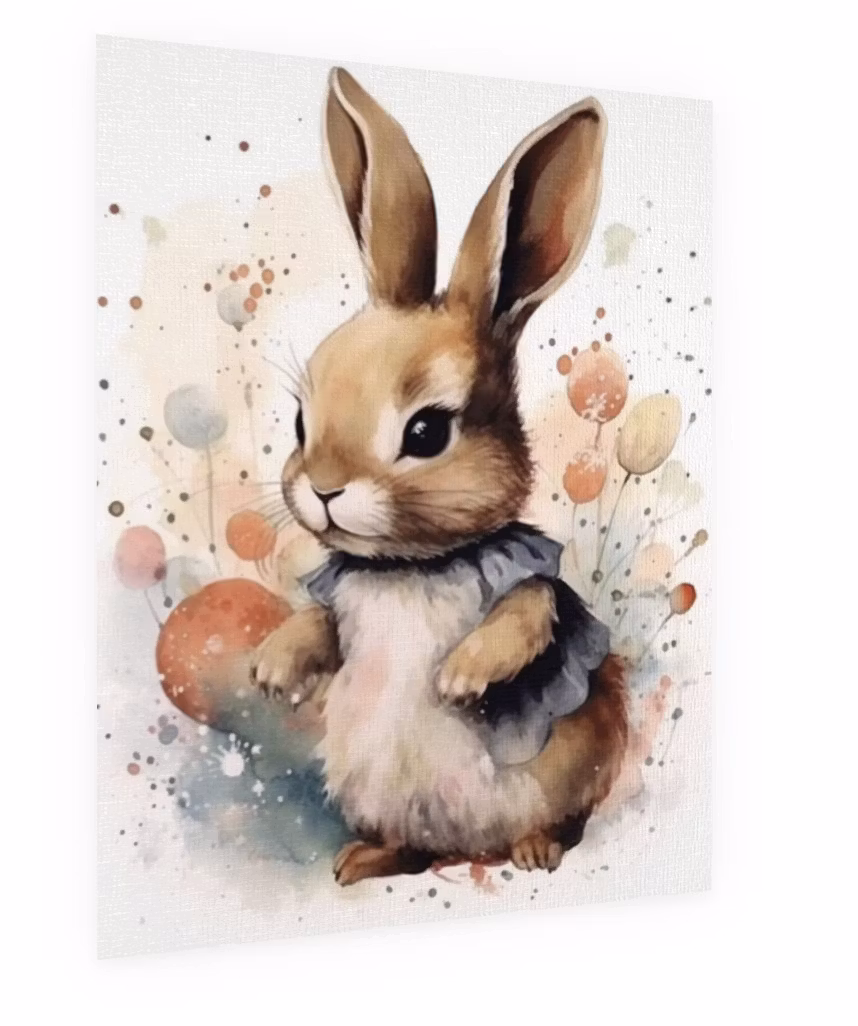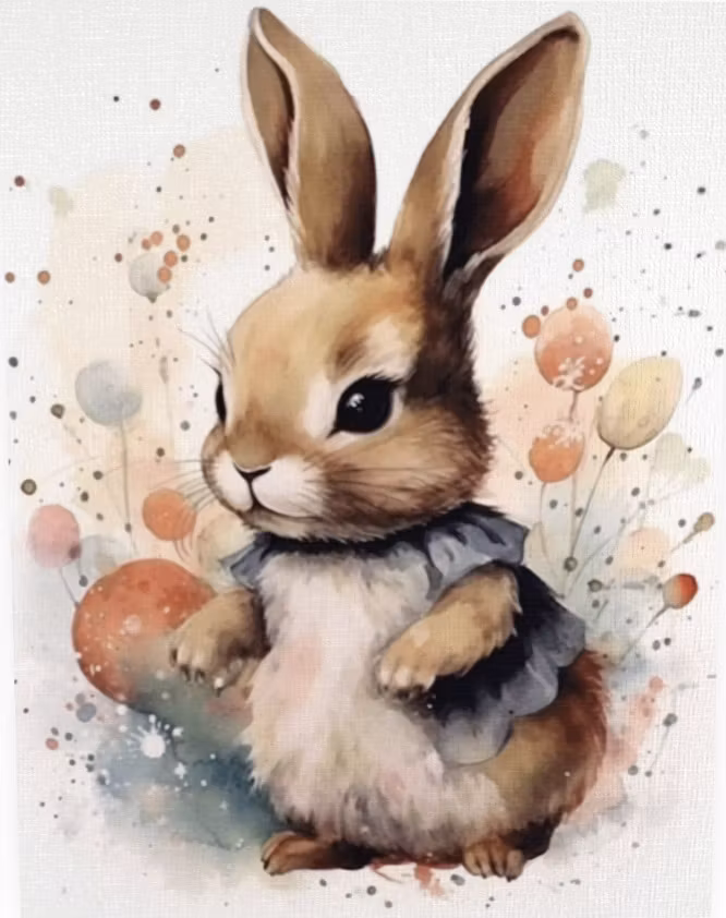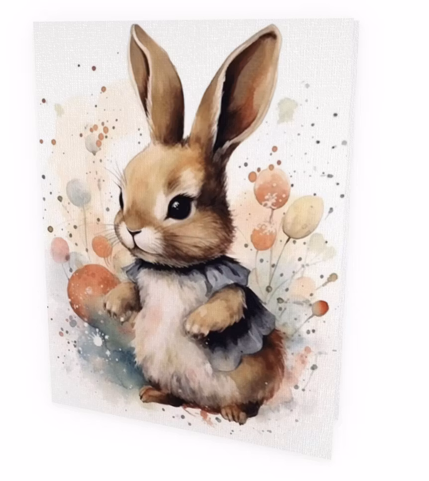 Underbart kort med den lilla kaninen kaninen som sitter mitt bland färger och konfetti. Kanske fyller han år eller är det något annat som firas?