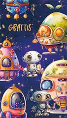 Härligt grattiskort med söta små rymdvarelser ute i rymden.