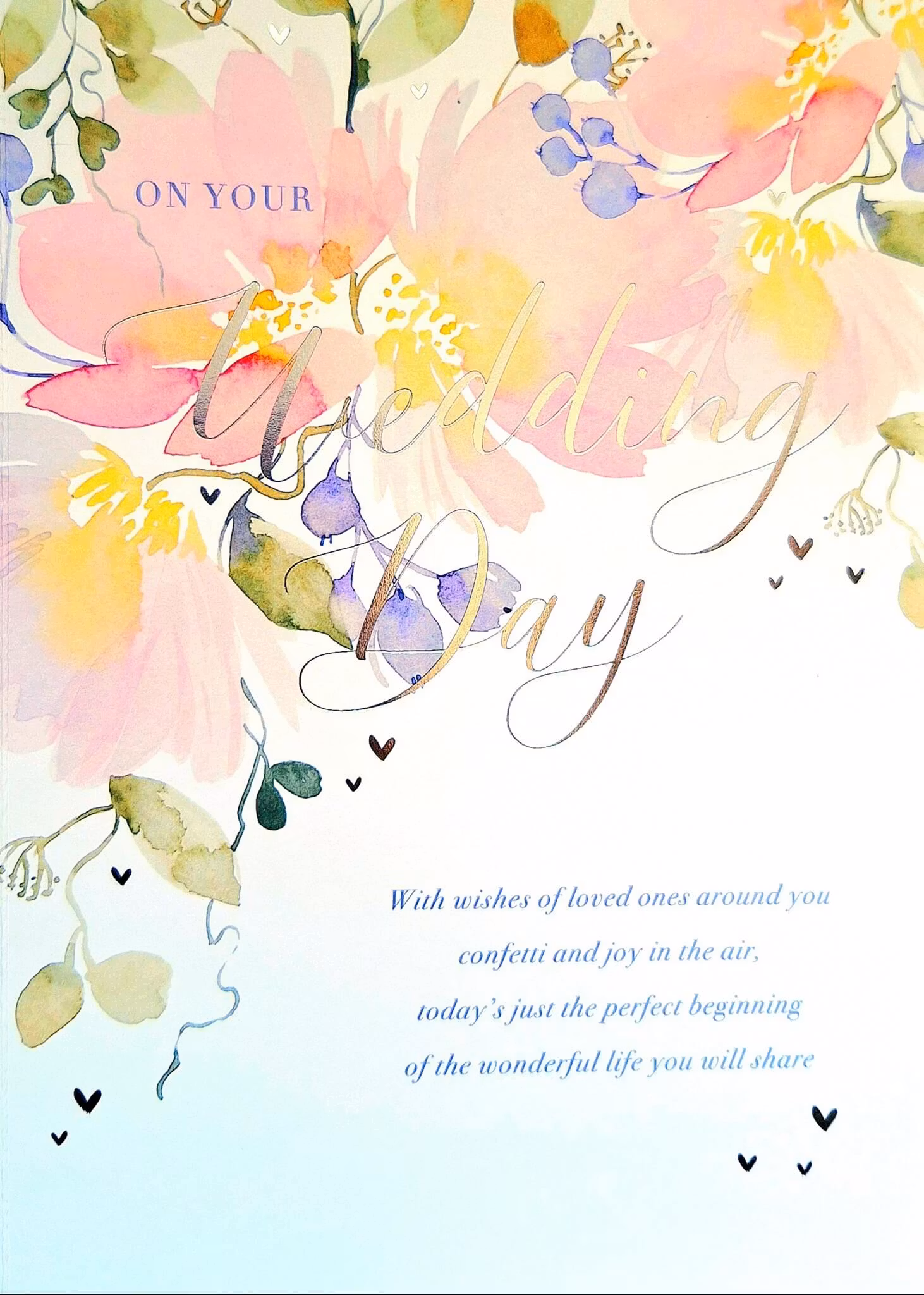 På kortet finns texten ”On your Wedding.” o "With wishes of loved ones around you, confetti and joy in the air, today's just the perfect beginning of the wonderful life you will share".