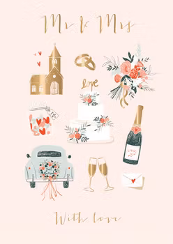 Underbart bröllopskort med alla delar som ingår i en klassisk vigsel.
