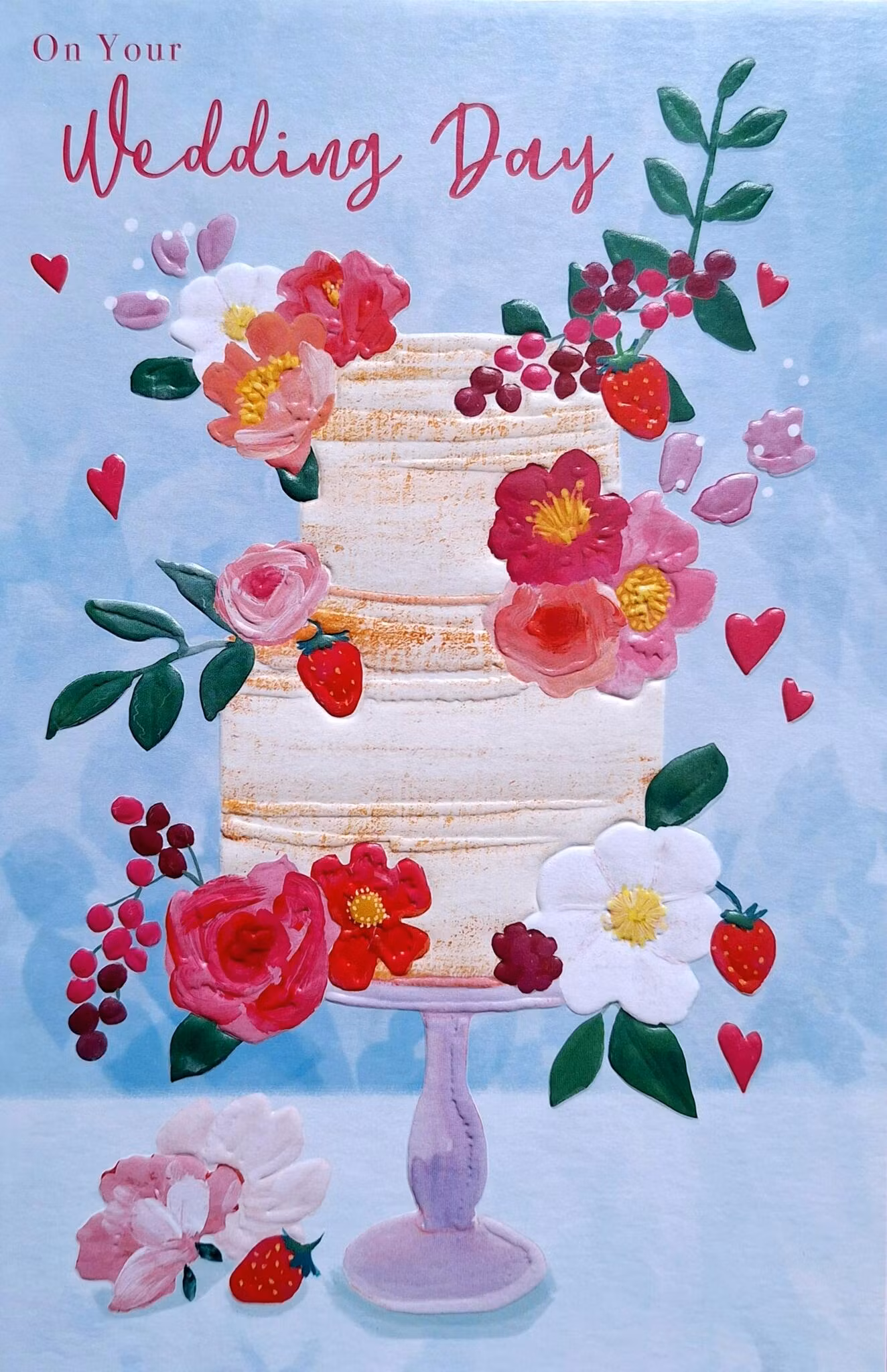 Härligt bröllopskort med den vackra bröllopstårtan som är dekorerad med blommor och bär.