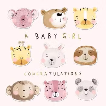 På kortet finns texten "A BABY GIRL, CONGRATULATIONS".