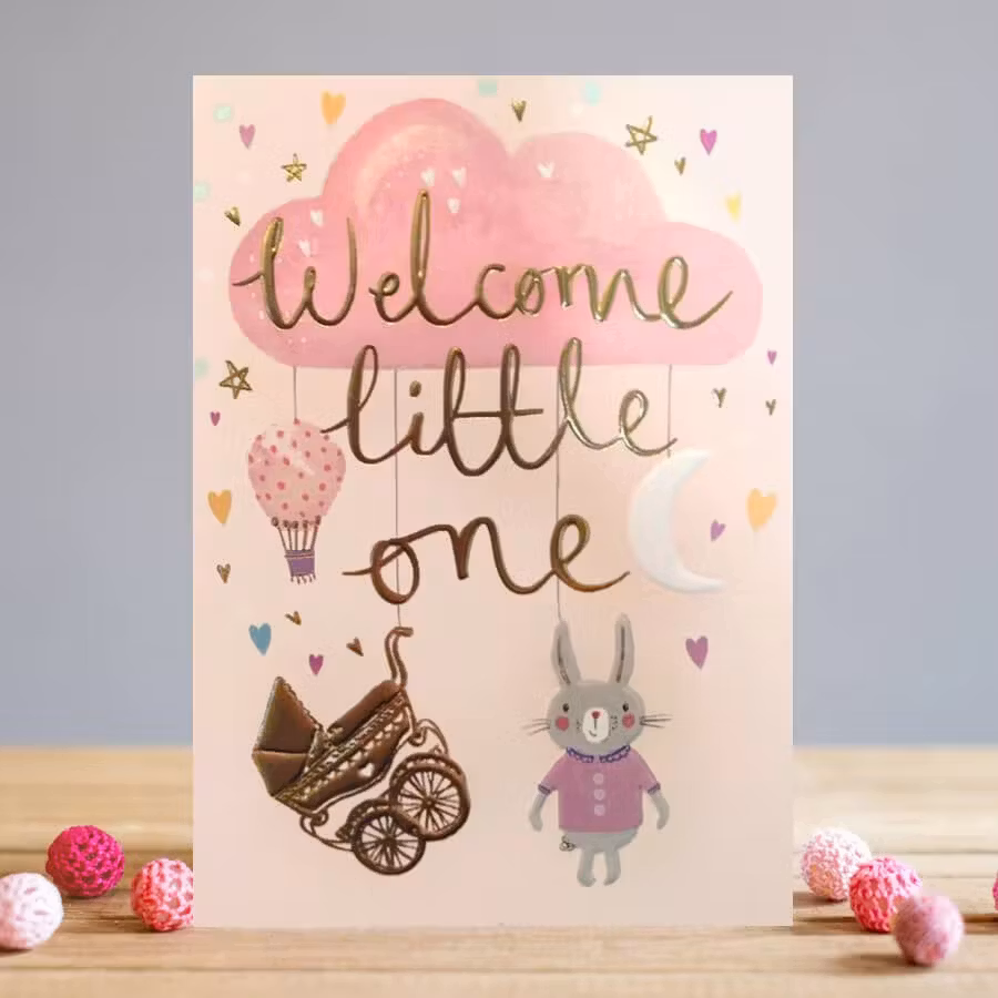 Ett riktigt fint kort med texten "Welcome little one". Både texten och många detaljer är förstärkta med guld för en lyxig känsla.