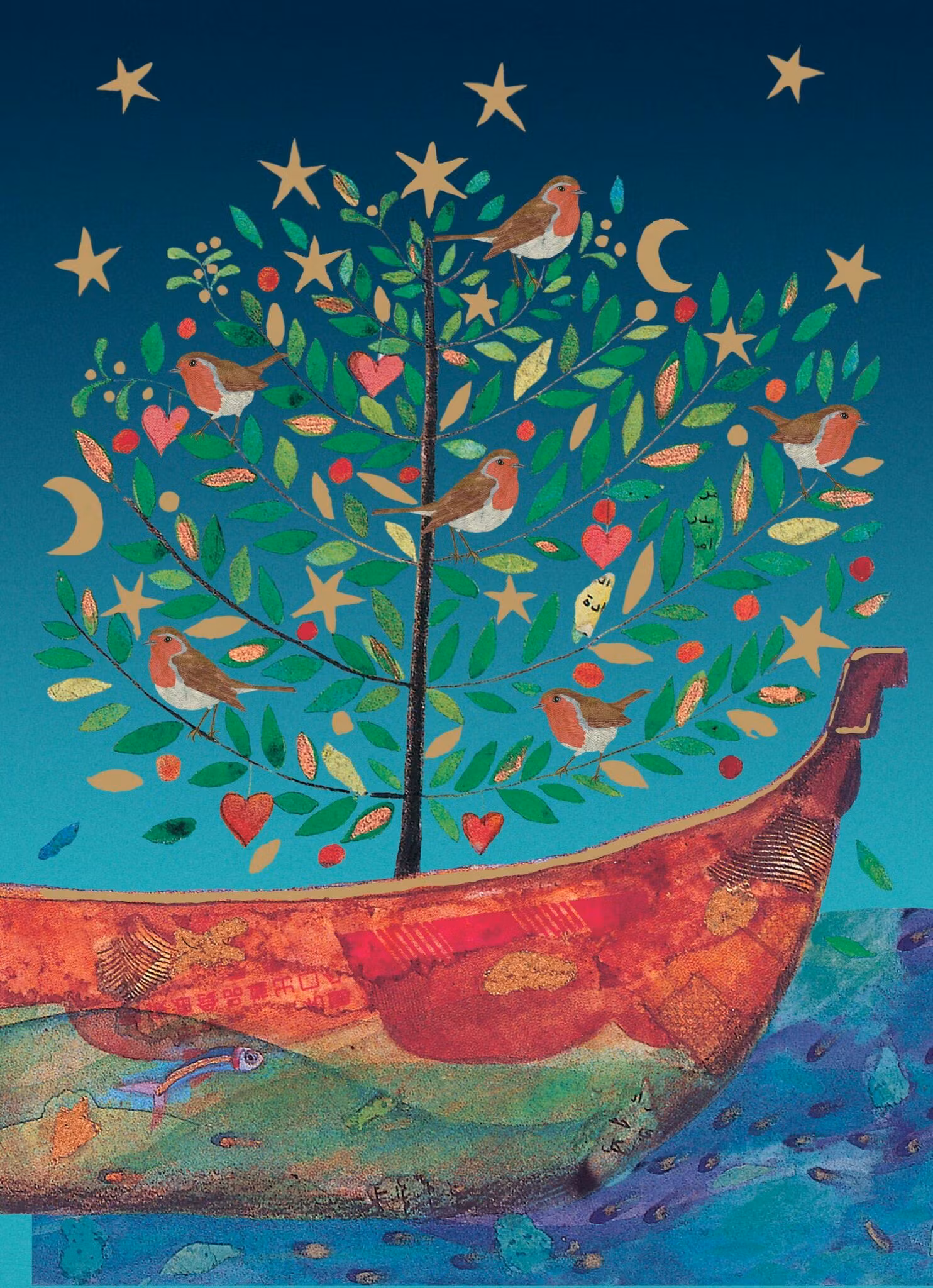 Ett vackert kort med trädet som växer i båten. I trädet finns stjärnor, hjärtan, fåglar och vackra löv.