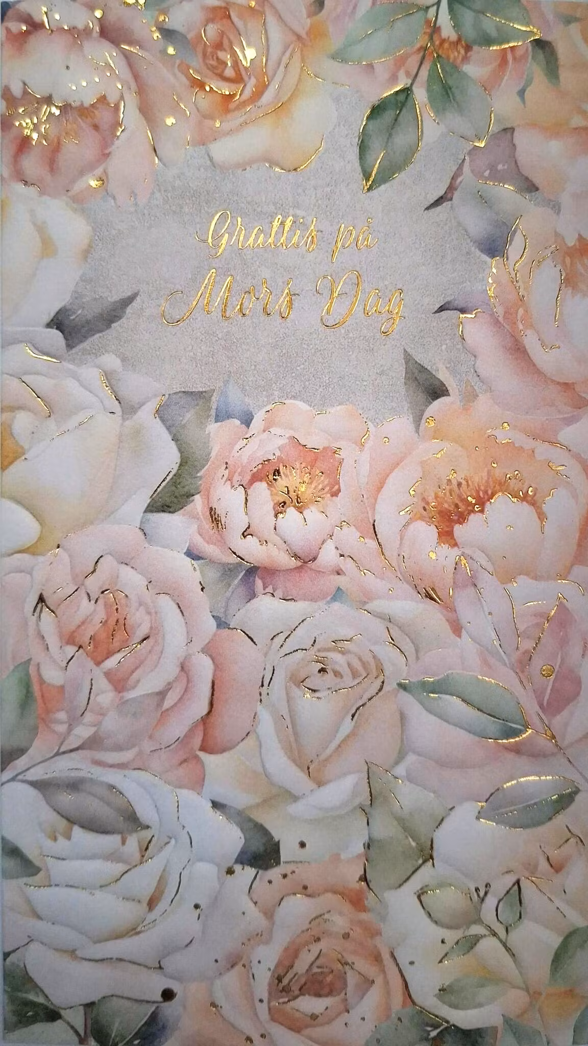 Vackert morsdagkort med vackra rosor i orangea toner.