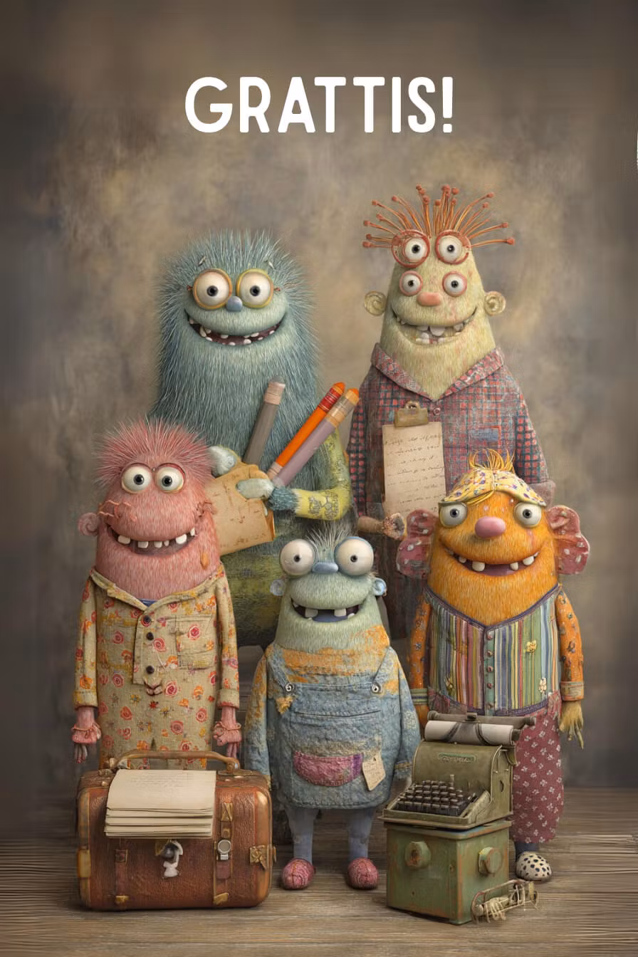 Här står hela det glada gänget och önskar mottagaren ett riktigt stort grattis.