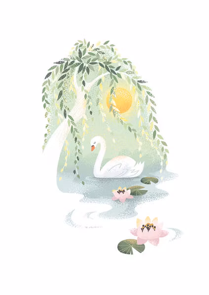 Ett härligt kort med den vackra svanen som vilar under sitt träd på den stilla sjön.
