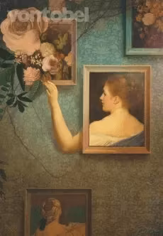 Ett härligt kort med kvinnan som sträcker sig utanför ramen för att nå de vackra blommorna.