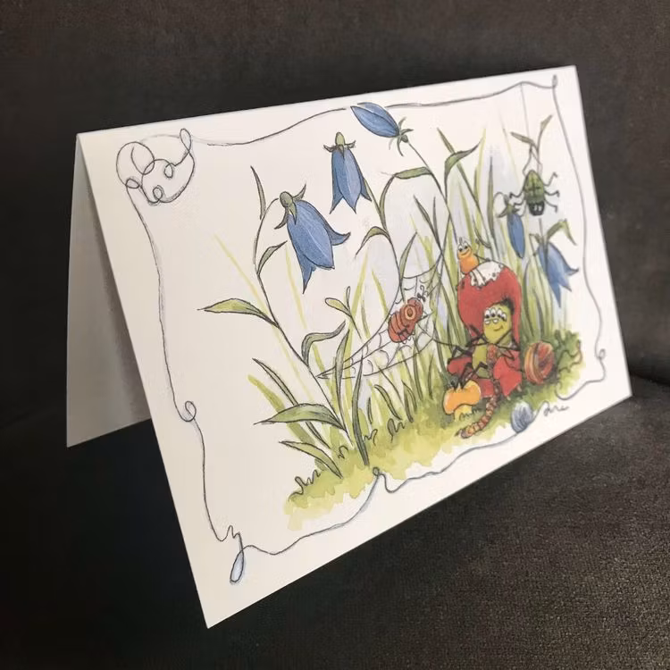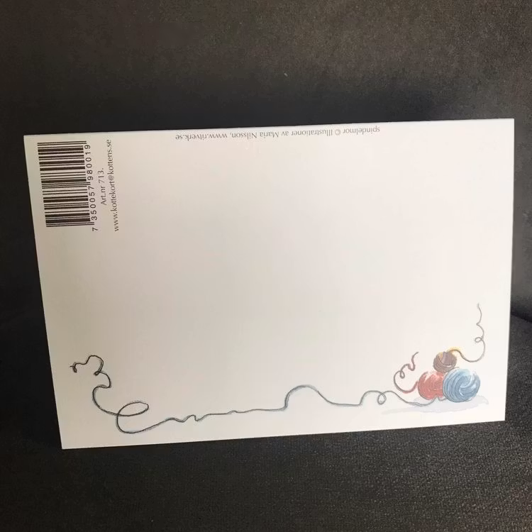 Härligt kort med en gammal spindel som sitter bekvämt tillbakalutad och stickar något fint. Kanske ska det bli en lång halsduk som någon som ska få som present till vintern? Spindelbarnen sitter och tittar nyfiket bredvid. På baksidan av kortet kan vi se att några grannystan har lyckats rulla iväg.