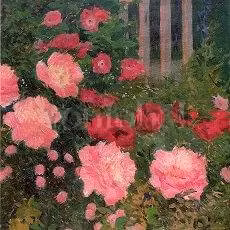Underbart kort med vackra, rosaröda rosenbuskar.