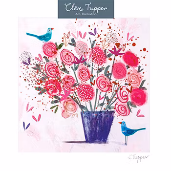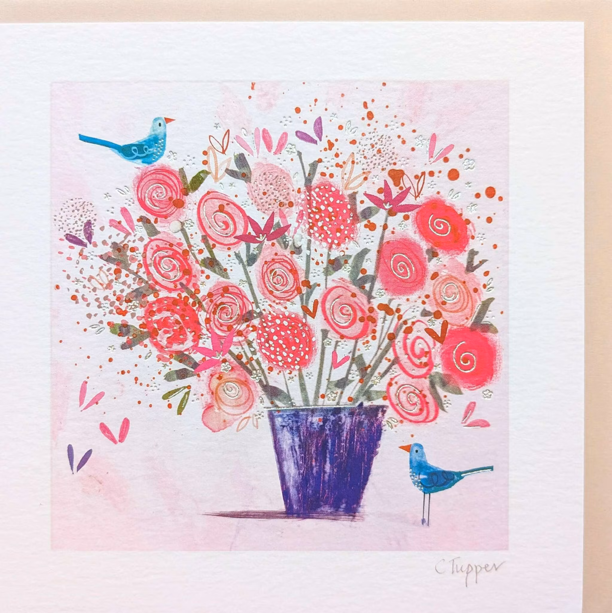 Vackert kort med vasen som är full av blommor och fåglarna som sitter tätt intill. Kortet har lite glitter på utvalda delar för en lyxigare känsla.