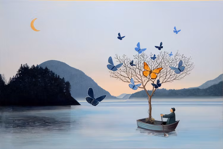 Ett så vackert kort med den lilla båten som sakta glider fram genom vattnet i sällskap av de underbart vackra fjärilarna.