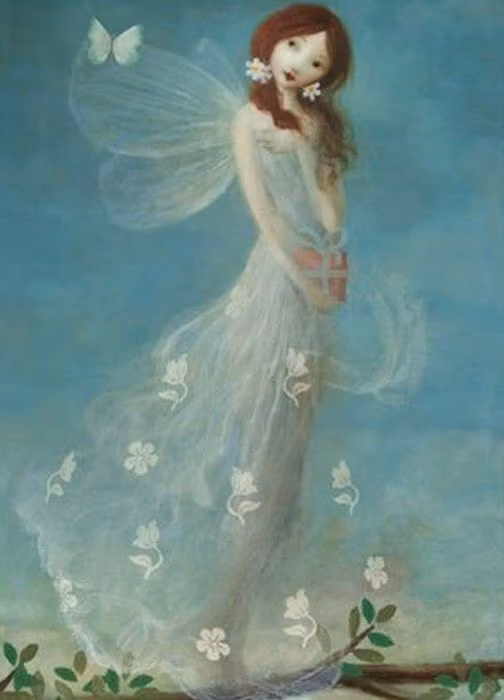 Fjärilsälvan balanserar på en trädgren och tittar förundrat på fjärilarna som svävar runt omkring henne. Ett mycket vackert och drömskt kort målat med vackra, milda färger.