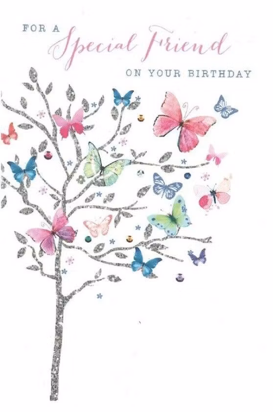 Vackert gratulationskort med fjärilarna som flockas i trädet och skänker färger till de kala grenarna. På framsidan står det "For a special friend on your birthday".