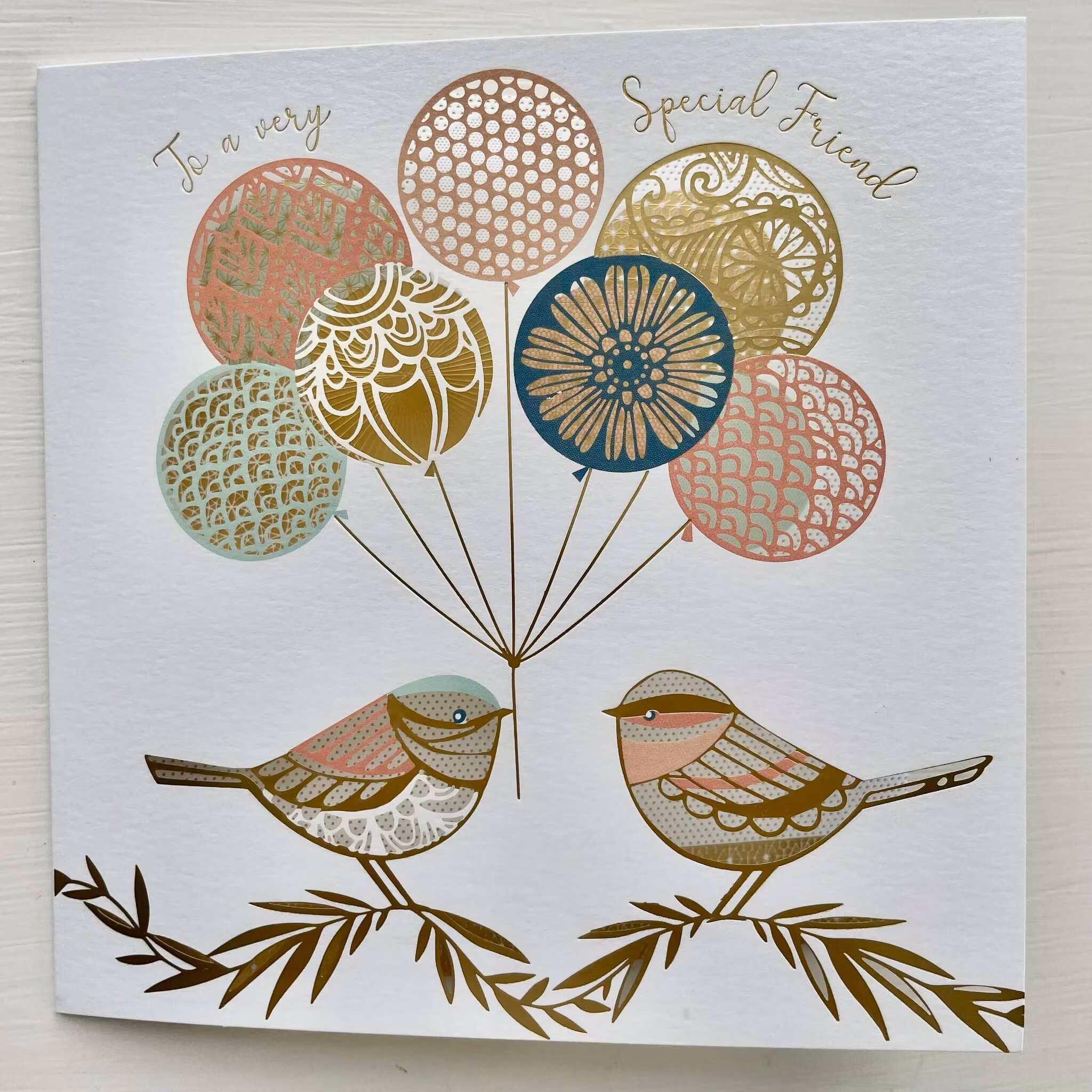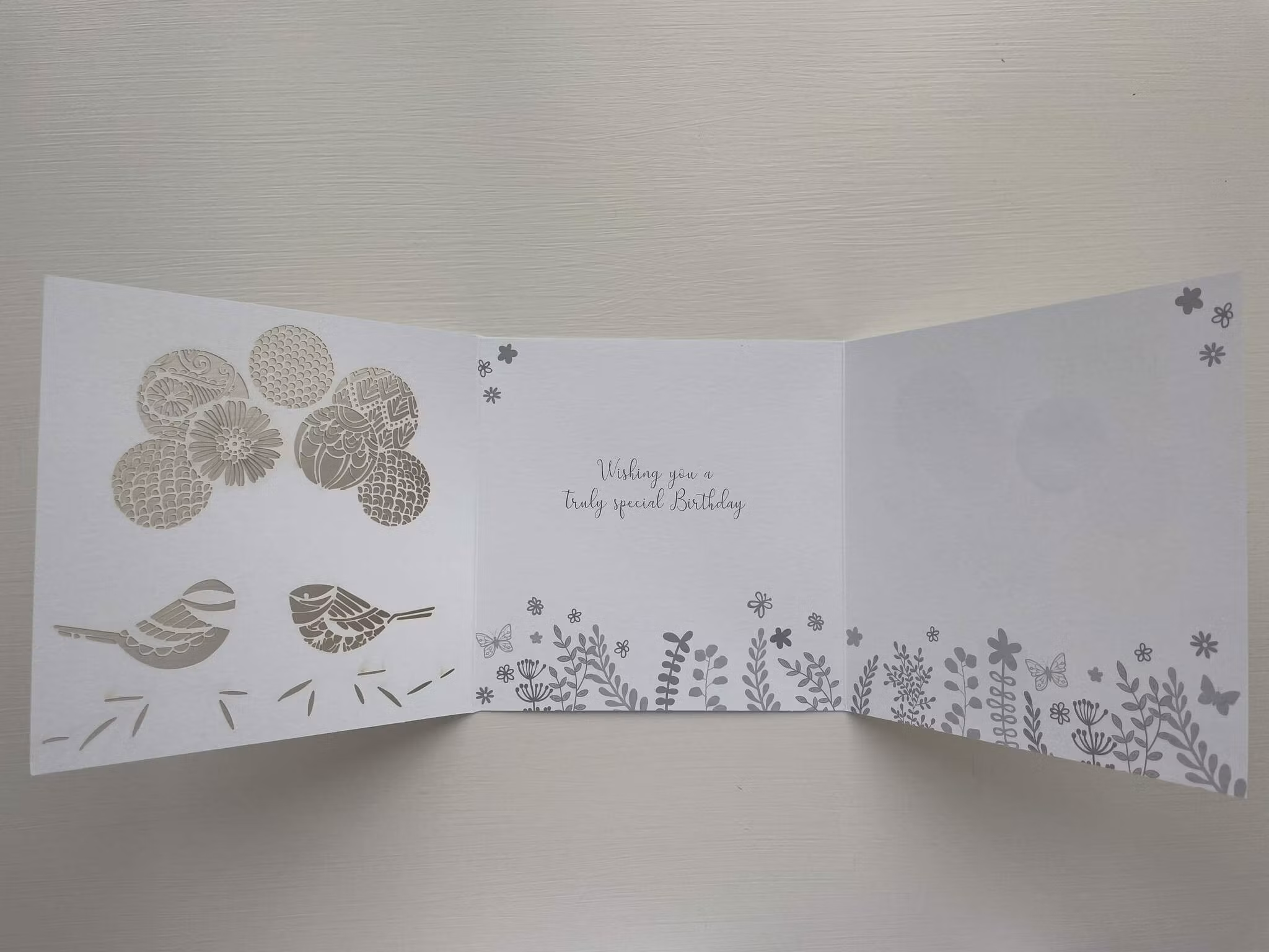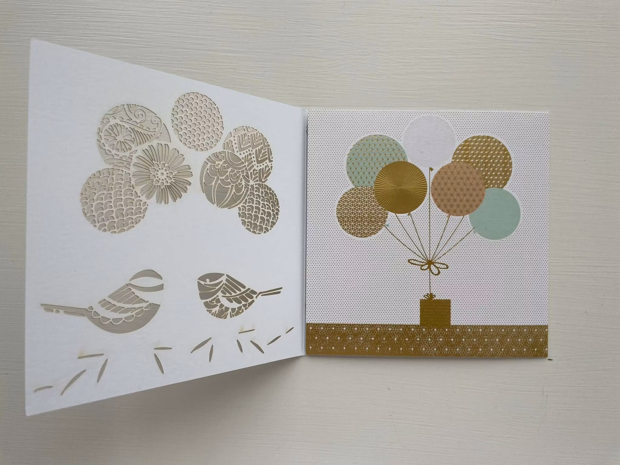 Härligt kort med gulddetaljer och genomsiktliga delar. Framsidan har hålrum där du ser detaljer från sidan bakom.