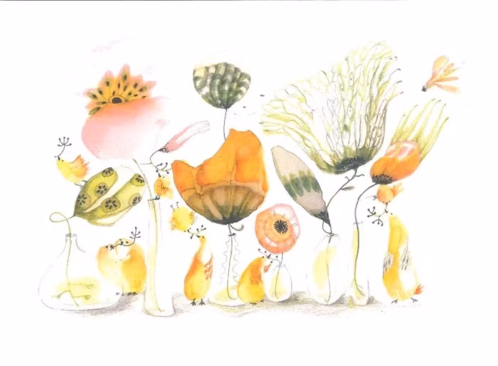 Härliga, gyllene toner på blommor och fåglar. Milda, vackra färger.