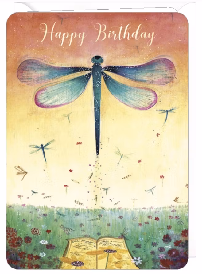 Magiskt kort med den vackra trollsländan som breder ut sina vingar. På kortet står det "Happy Birthday". Dubbelvikt kort med en blank insida. Med kuvert.