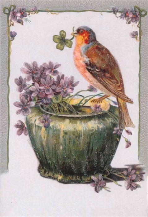 Tänk vilken tur fågeln har haft. Att hitta en fyrklöver på en sommaräng är inte lätt. Jag undrar vad han önskar sig... Kortet har glitter på motivet.