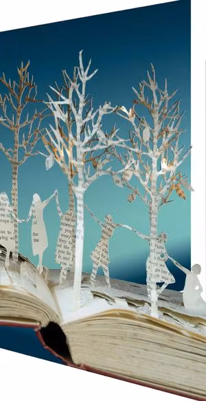 Härligt, laserskuret kort med flickorna som dansar i skogen över den öppna boken. Här är många detaljer utskurna från första sidan så att du ser en del av insidan från framsidan på kortet. Mycket vackert och arbetat kort.
