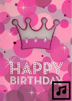 Fantastiskt grattiskort med den stora, rosa kronan som tänds upp när kortet öppnas. Då spelas också låten "Dancing Queen". Kuvert medföljer.