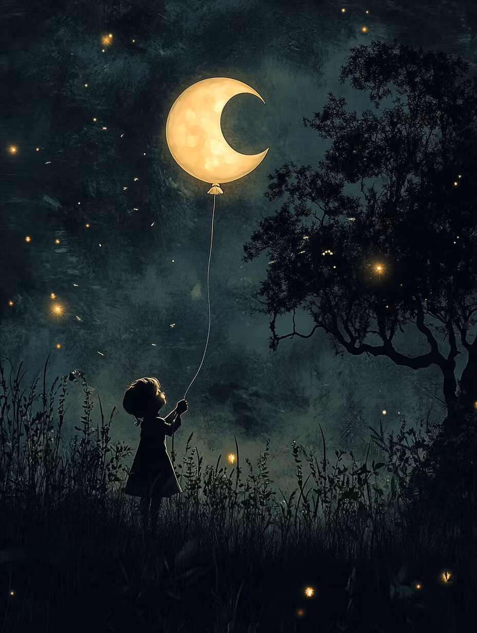 Underbart vackert kort med barnet som håller i månen som är en ballong.