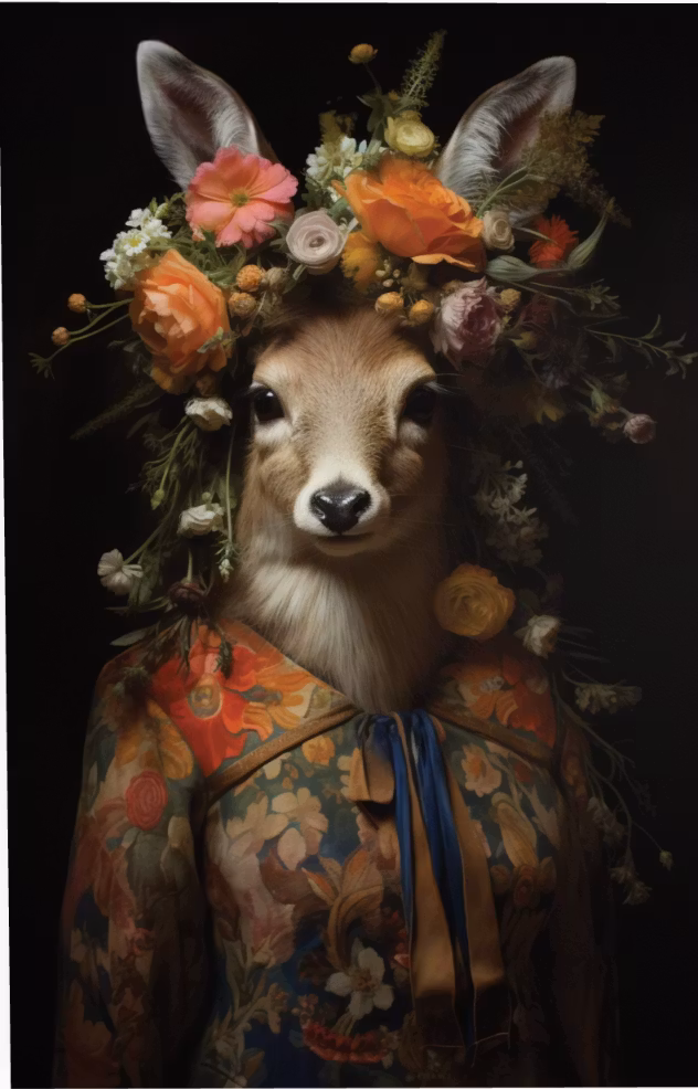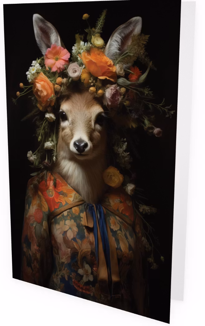 Underbart vackert kort med det vackra sagorådjuret som har klätt sig i blommor från både topp till tå.