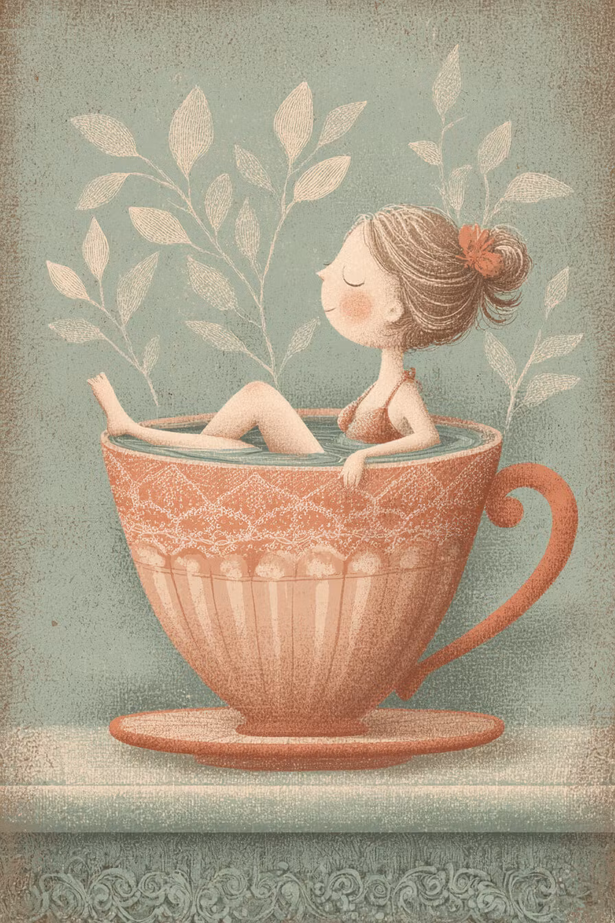 Underbart kort med ett härligt, varmt bad i en vacker kopp.