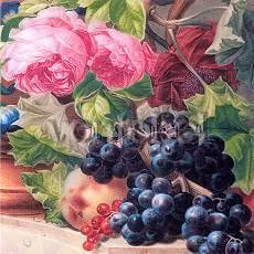 Underbart kort med grönska, rosor, persika och olika slags bär och druvor.