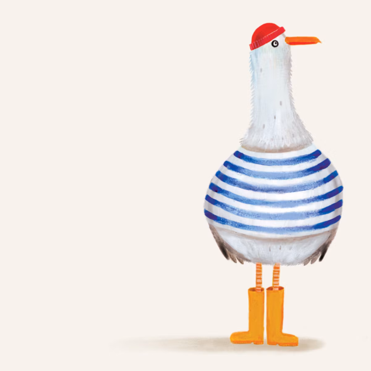 Underbart kort med den coola fiskmåsen med sin fina tröja och gummistövlar.