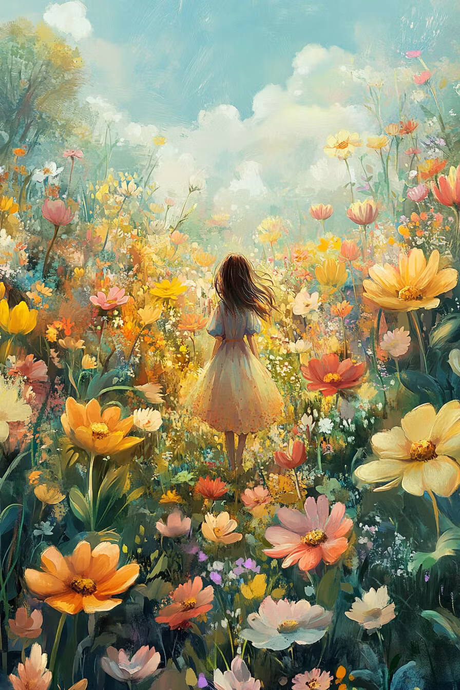 Fantastiskt kort med flickan som vandrar fram genom ett hav av enorma blommor.