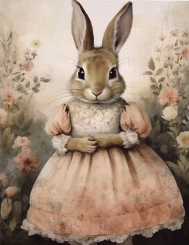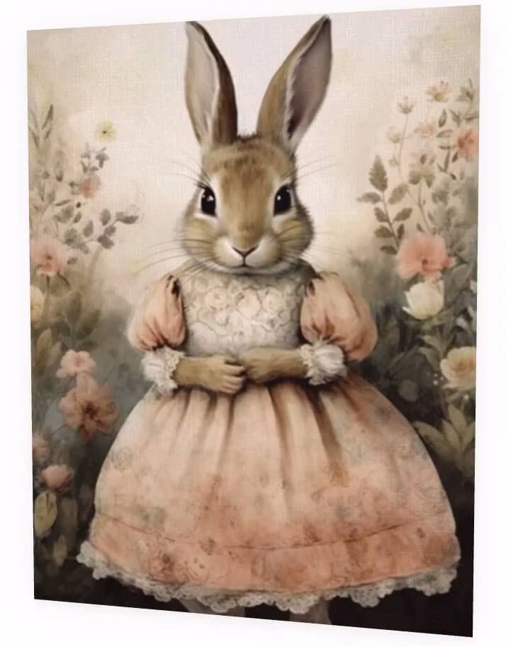 Underbart kort med kaninen i den rosa klänningen omgiven av blommor.