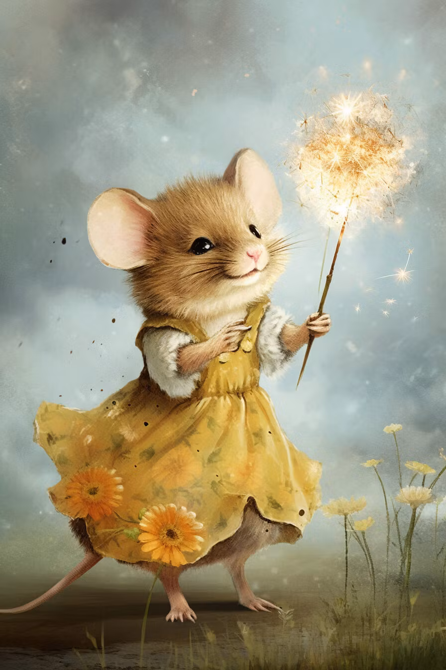 Underbart kort med den lilla musen och den stora, vackra maskrosen.