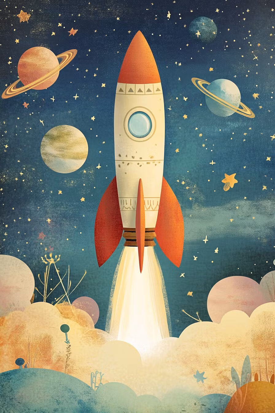 Härligt kort med retrokänsla och raketen som flyger rakt ut i rymden, på väg mot äventyr bland stjärnorna.