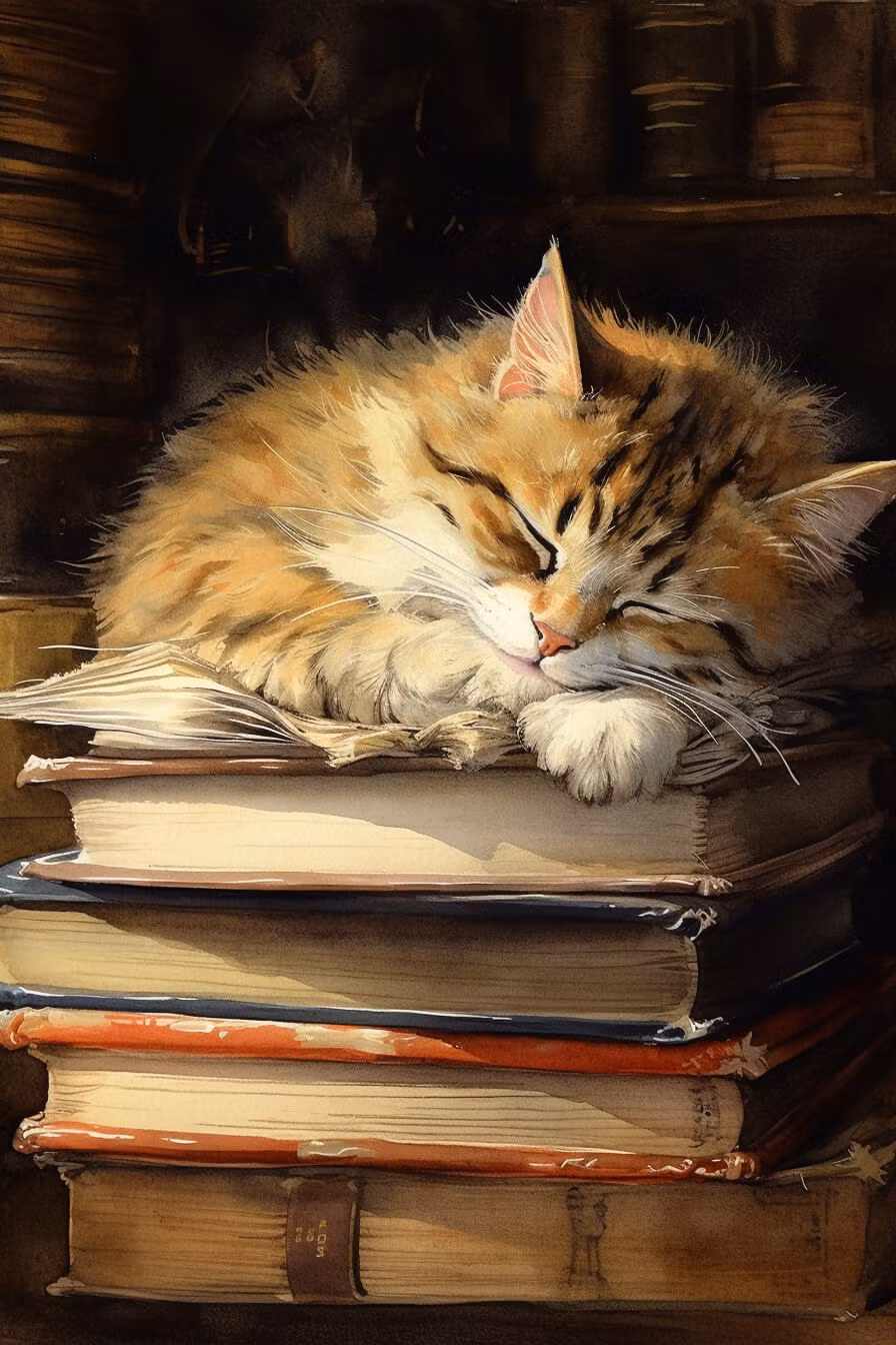 Underbart kort med katten som somnat ovanpå högen med böcker.