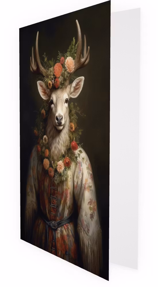 Underbart vackert kort med den ståtliga sagohjorten som har klätt sig extra fint och smyckat sig med blommor.