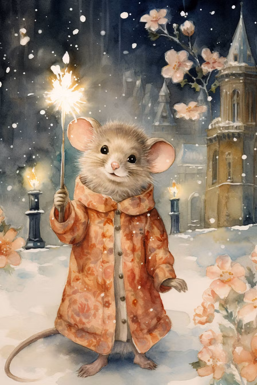 Underbart kort med den lilla musen som är så glad och håller hårt i de festliga tomteblossen