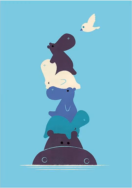 Härligt kort med flodhästarna som tillsammans bildar ett så högt torn att den som är högst når upp ändå upp till fåglarna.