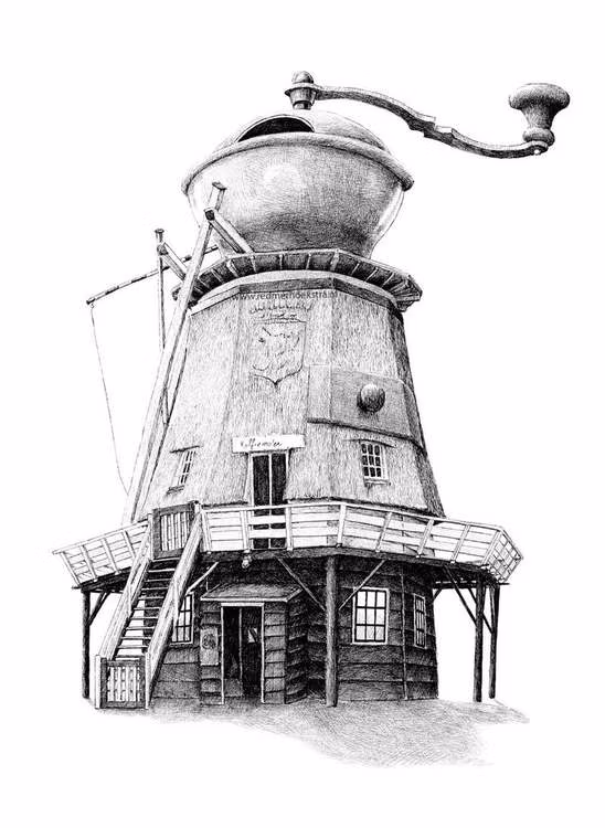 Känner du någon som älskar kaffe? Då kanske det här kan vara något som passar att få en grattishälsning på. Här är kaffekvarnen lika stor som en väderkvarn. Tän