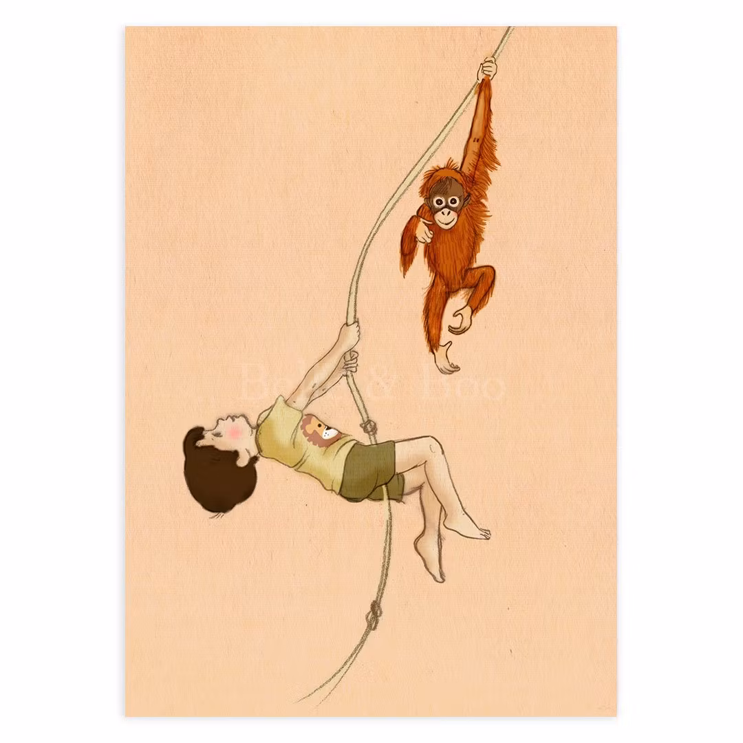 Här svingar sig pojken tillsammans med sin vän orangutangen.