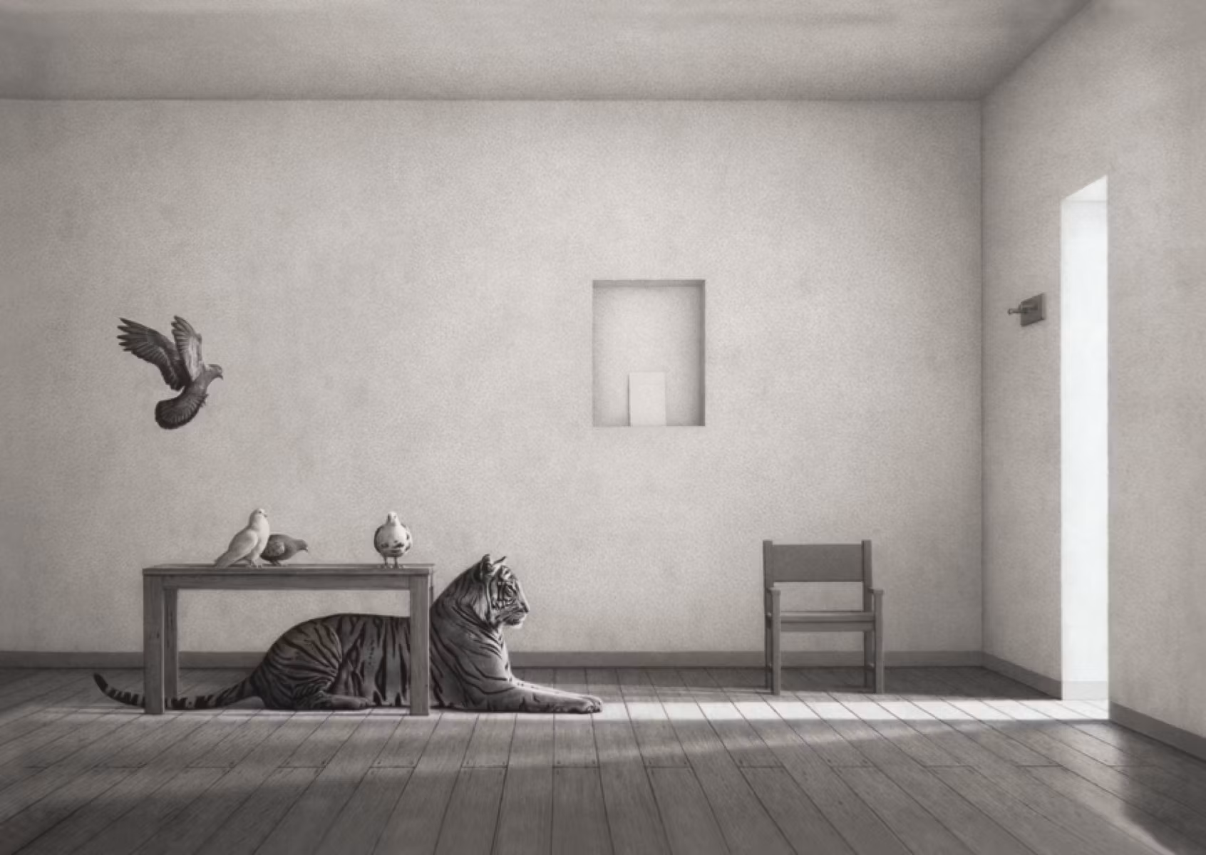 Underbart vackert kort med tigern och duvorna som tålmodigt väntar med blickarna riktade mot den öppna dörren.